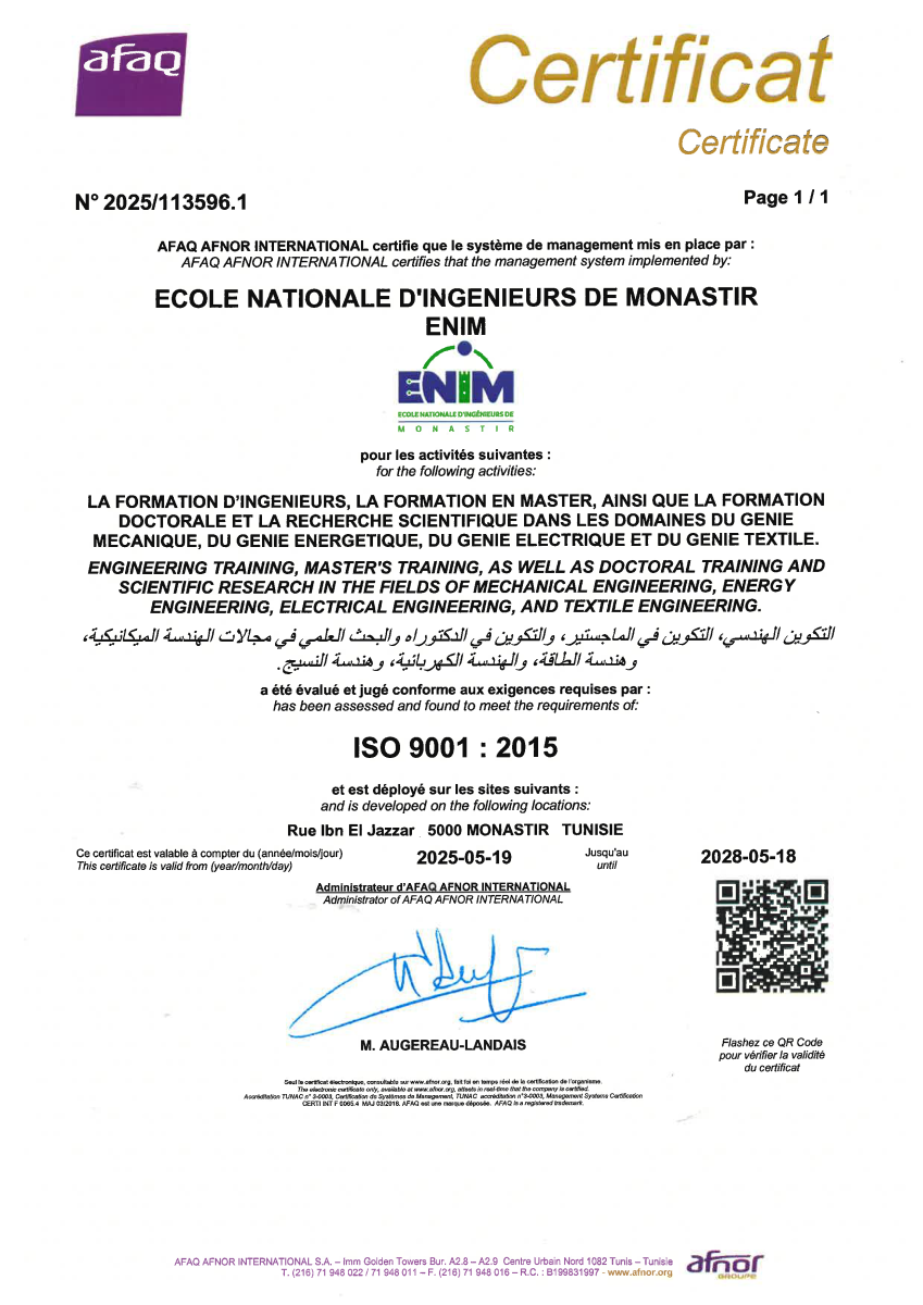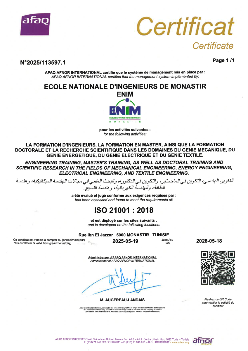 Nous avons également amélioré notre Système de Management de la Qualité et, grâce aux efforts de l’ensemble des parties prenantes (enseignants, administratifs, techniciens et étudiants), nous avons obtenu les certifications ISO 9001 et ISO 21001 sur 3 ans depuis 19 mai 2025.